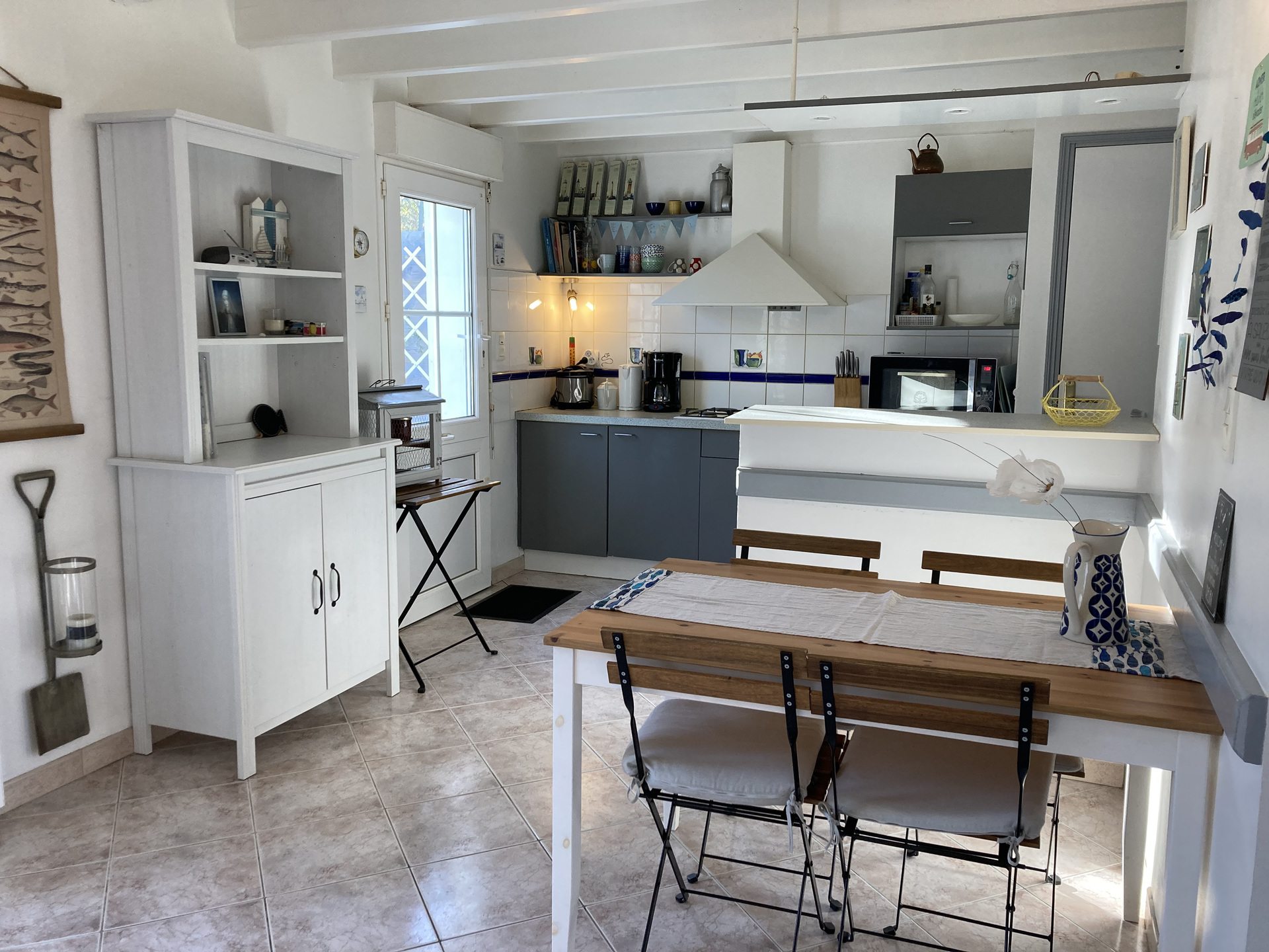 - Une cuisine ouverte équipée (7 M²) avec feux gaz, four, micro-ondes, cafetière filtre, grille pain, bouilloire.