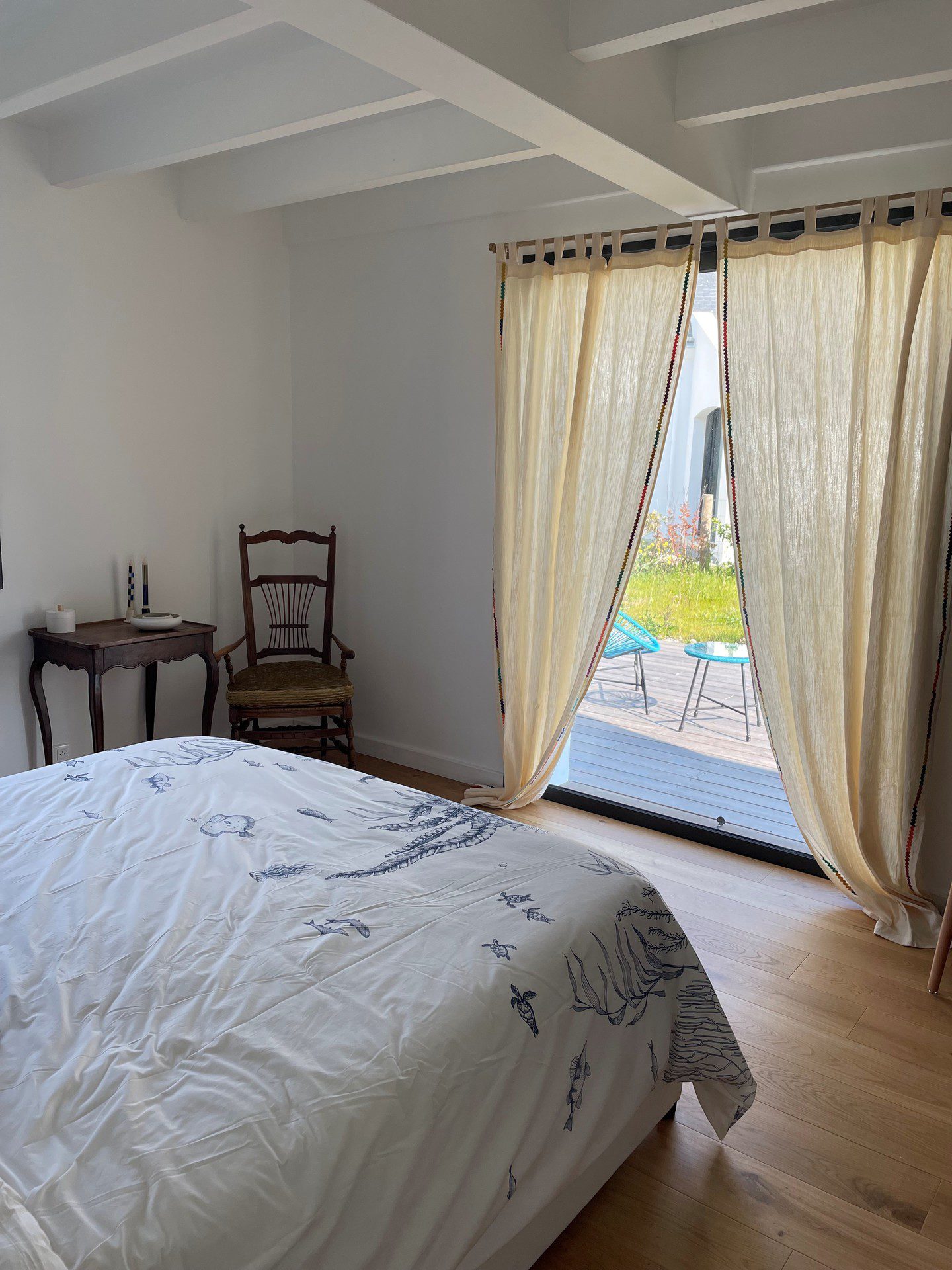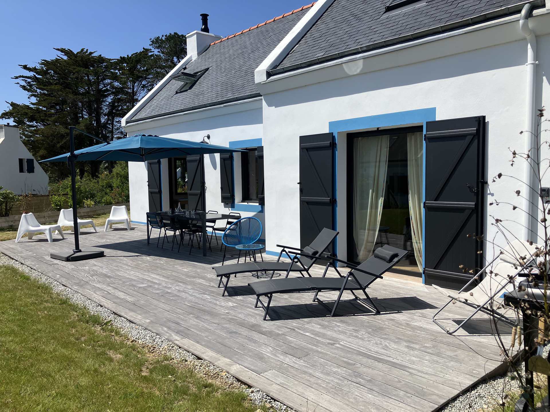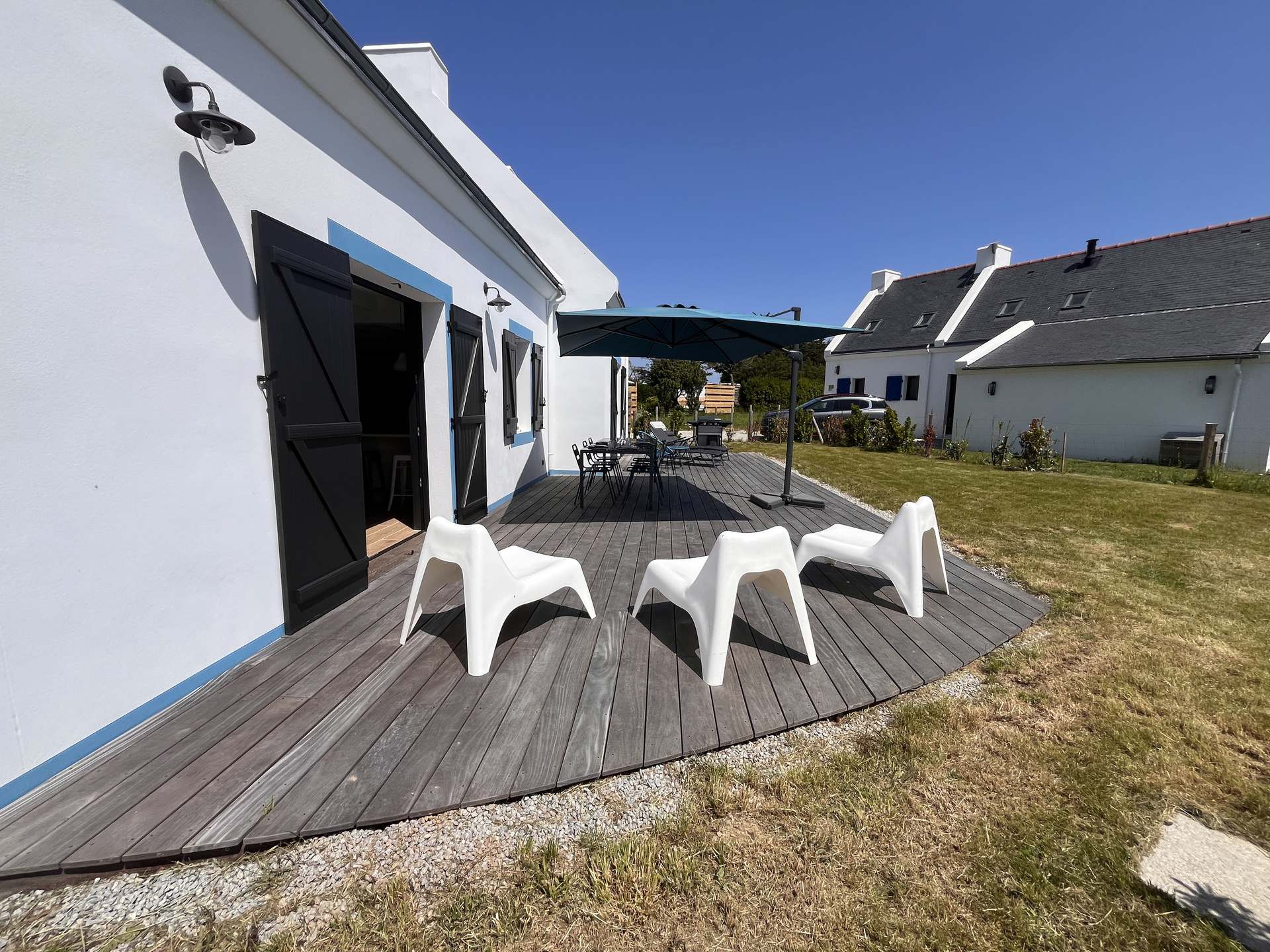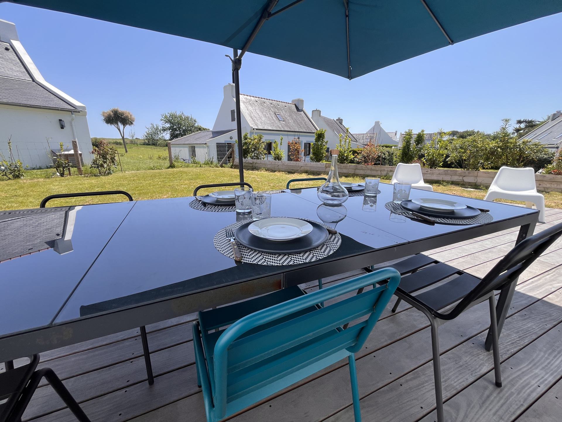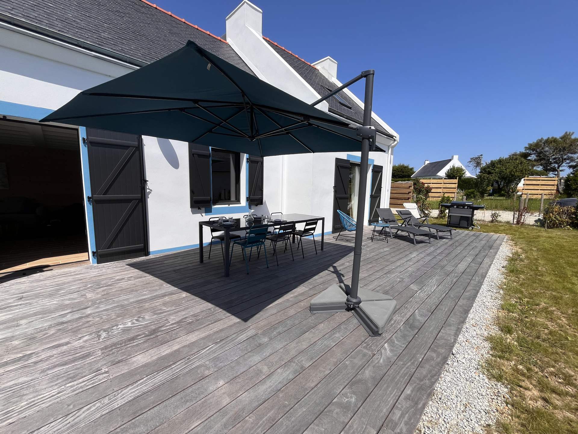 La maison dispose d'un jardin non clos de 400 m² avec une terrasse de 80m² équipée d'un salon de jardin, d'une plancha, d'un parasol ainsi que de deux chaises longues.