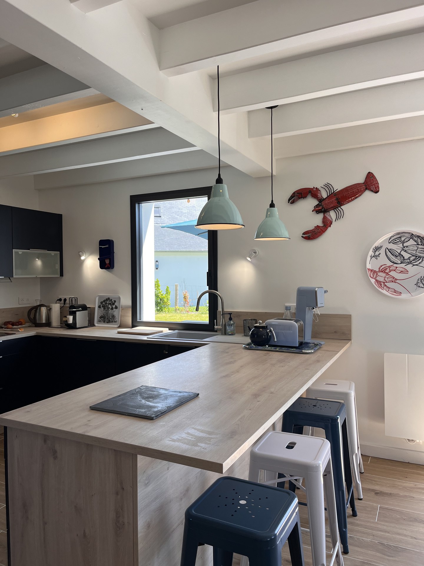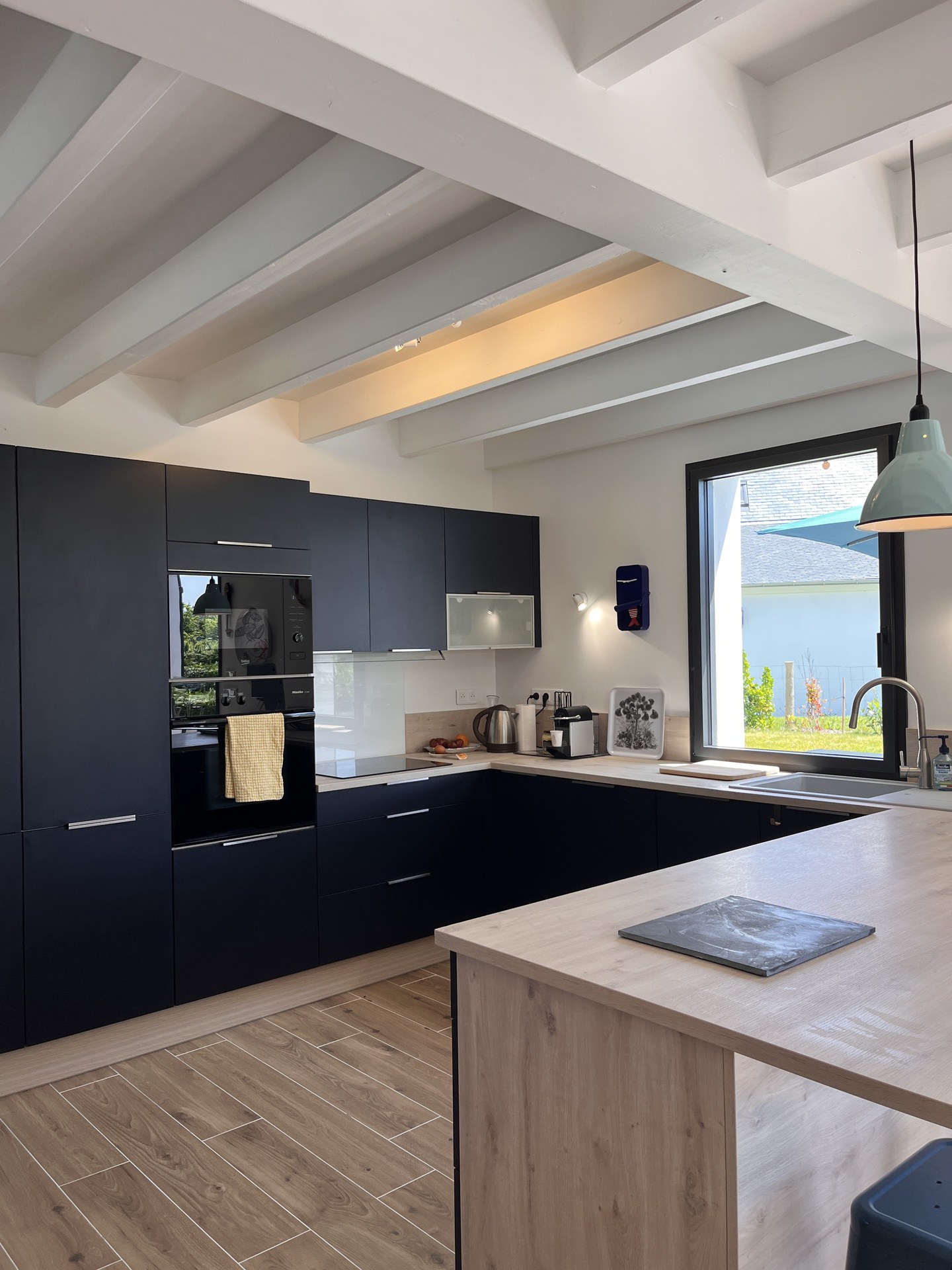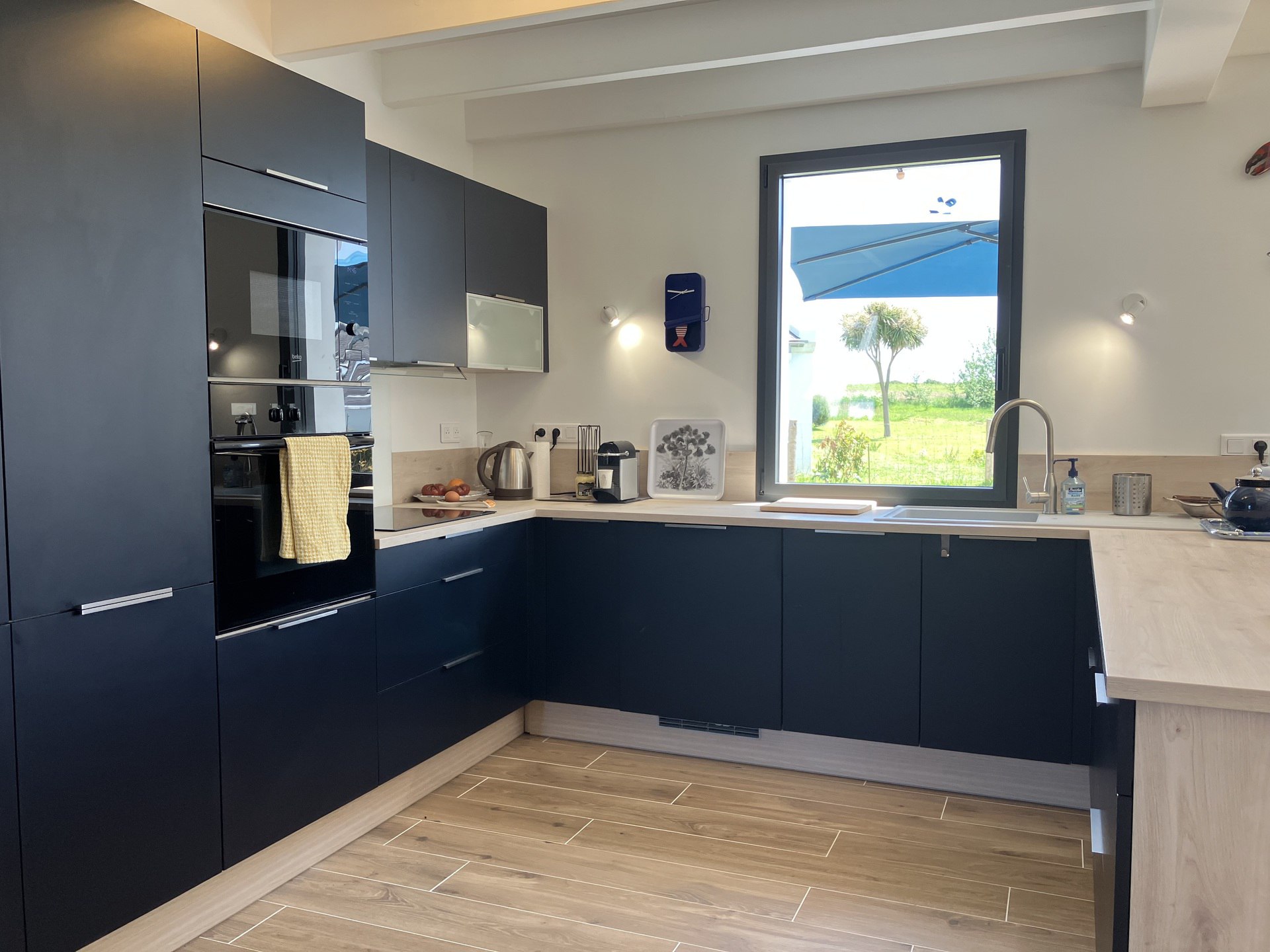 - Une cuisine ouverte entièrement équipée avec plaque à induction, un réfrigérateur (grand freezer), un four, un micro-ondes, un lave-vaisselle, un grille-pain, une bouilloire et une cafetière Nespresso.