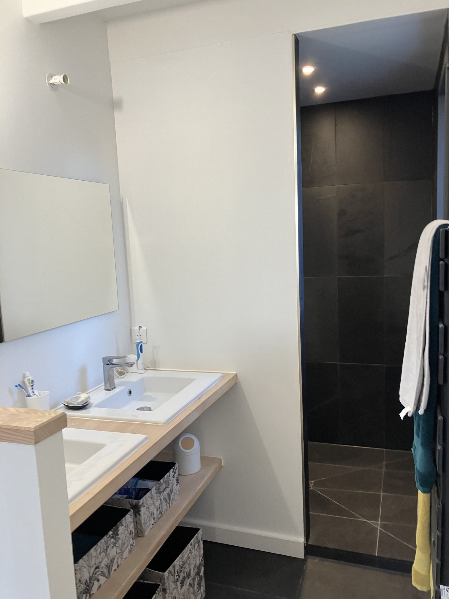 - Une salle d'eau attenante à la chambre (3.85 M²) avec une douche, deux vasques et un sèche-cheveux.