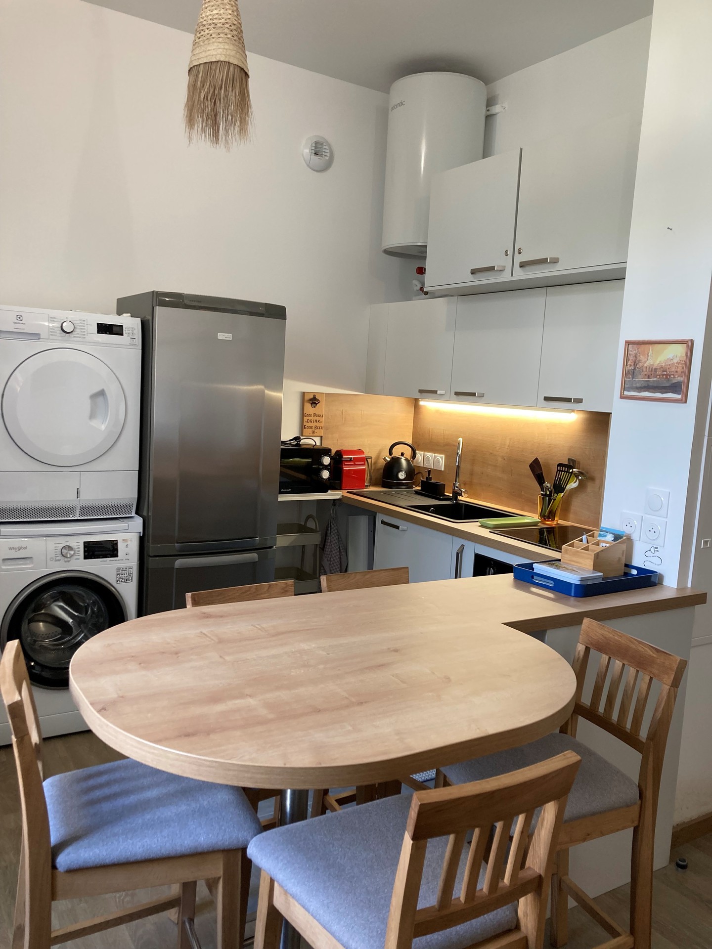 - Cuisine aménagée, équipée d'une plaque à induction, un four traditionnel, un micro-ondes, un réfrigérateur, un congélateur, une cafetière Nespresso, un grille pain, une bouilloire, un sèche linge et un lave linge.